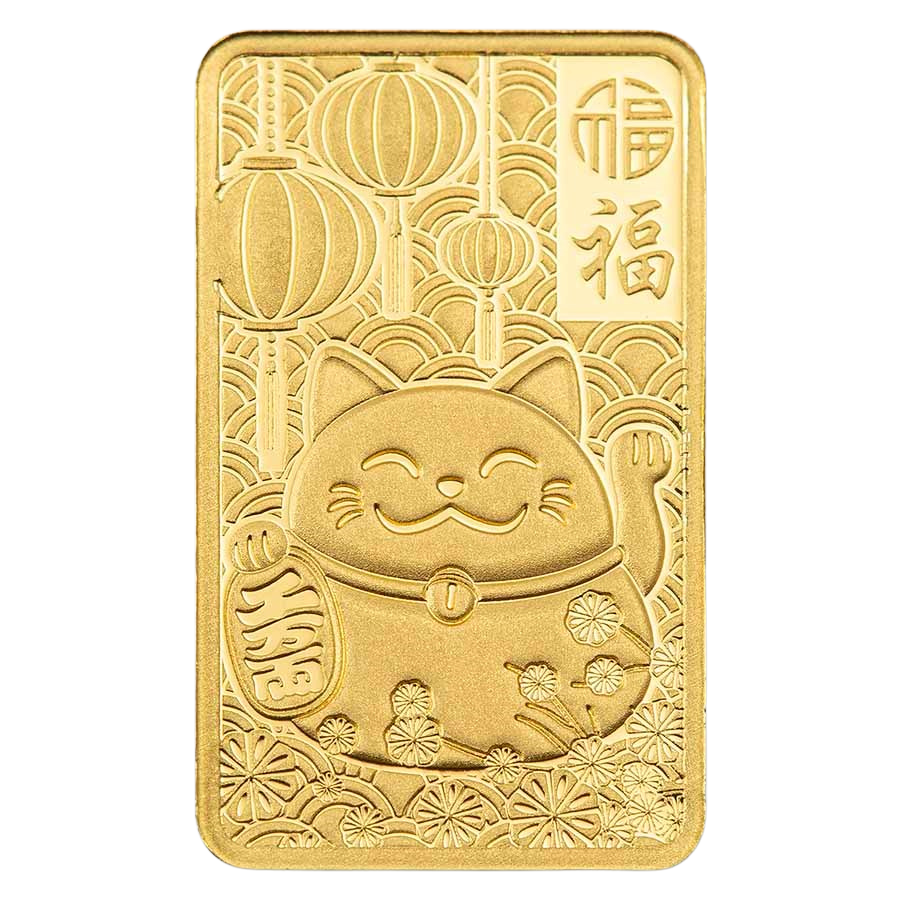 This product features the unique Lucky Cat design on the front, making this gold bar a great collector’s item and investment.