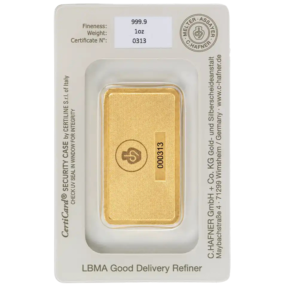 Our German-made 1 ounce C.Hafner gold bars boast 24 Carats, 99.99% purity, and are LBMA approved, making them a great option for first-time investors and collectors.