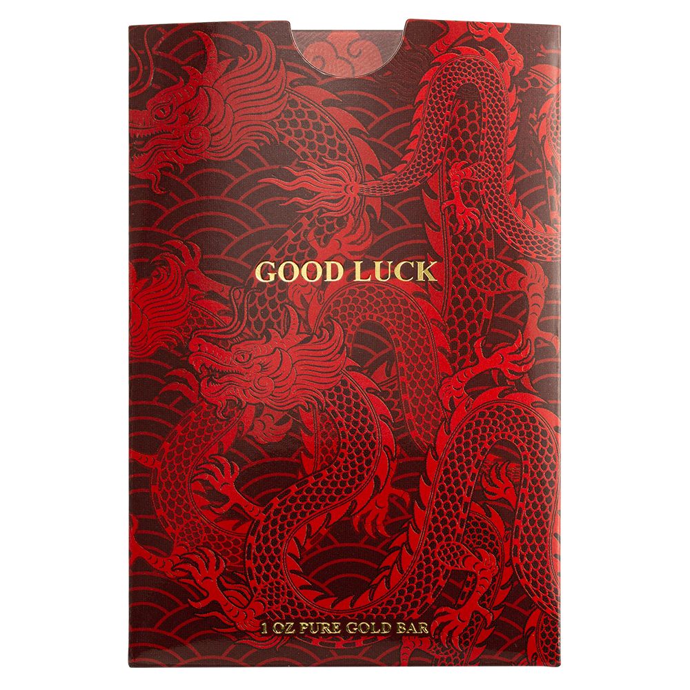 Each 1oz Good Luck Yellow Dragon bar is accompanied by a vibrant gift sleeve.