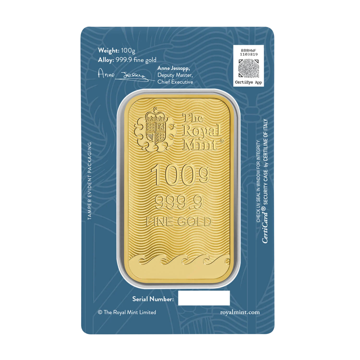 All of our 100 gram Royal Mint gold bars carry LBMA approval. Each of our 100g gold bars is stamped with a unique serial number, enabling you to trace its purity.