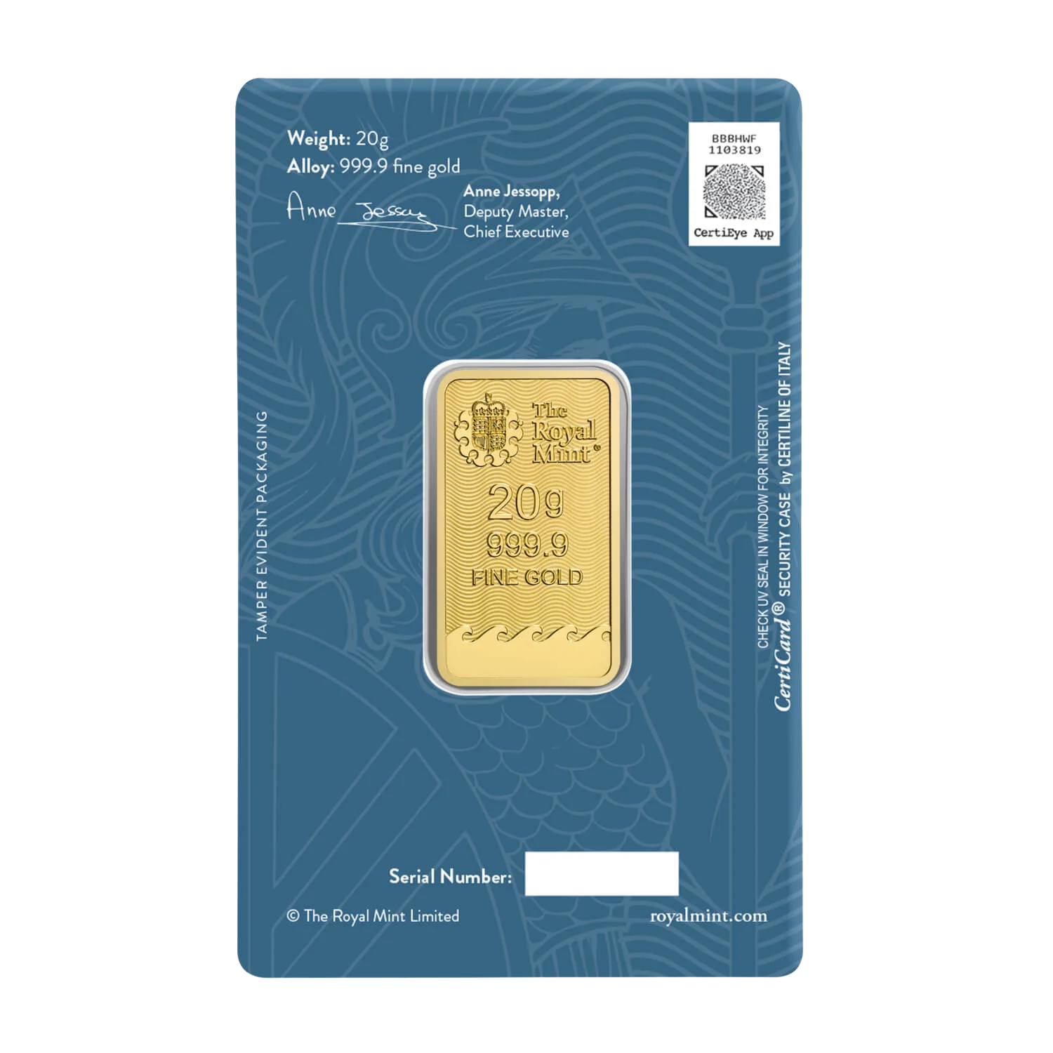 All of our 20 gram Royal Mint gold bars carry LBMA approval. Each of our 20g gold bars is stamped with a unique serial number, enabling you to trace its purity.