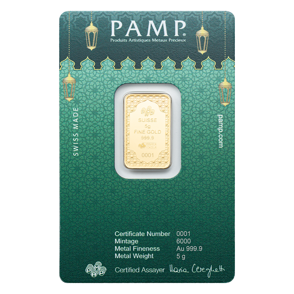 Each 5 gram PAMP Eid Mubarak gold bar comprises 24 carat gold, ensuring a brilliant shine and lasting value. Whether you're a seasoned investor or a discerning collector our 5 gram gold bars are a smart choice.