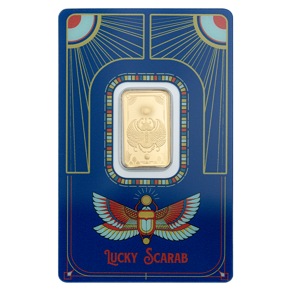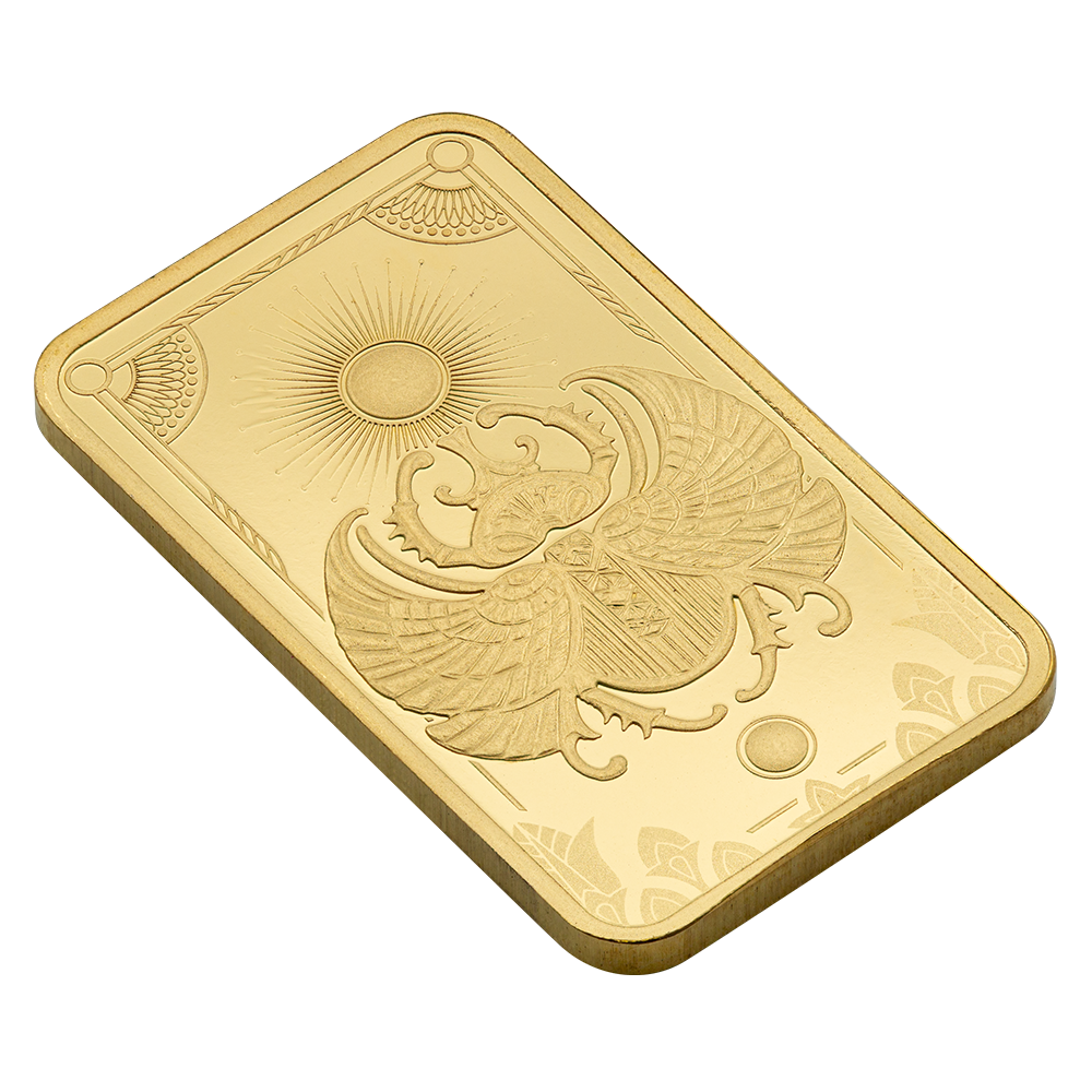 Drawing inspiration from Egyptian legend, where the scarab was revered as a symbol of transformation and prosperity, this 5g gold bar is beautifully crafted as a golden emblem of protection, renewal, and good fortune. Individually serialized and housed in a vibrant CertiPAMP™ card, this pure gold bar has a mintage of 6,000 pieces.