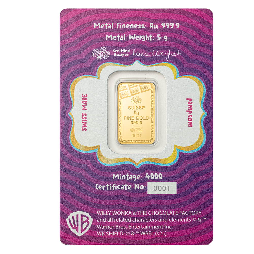 All our 5 gram PAMP Willy Wonka Chocolate Design gold bars are brand new, delivered in a credit card-sized package with a unique serial number so you can track the gold’s quality.