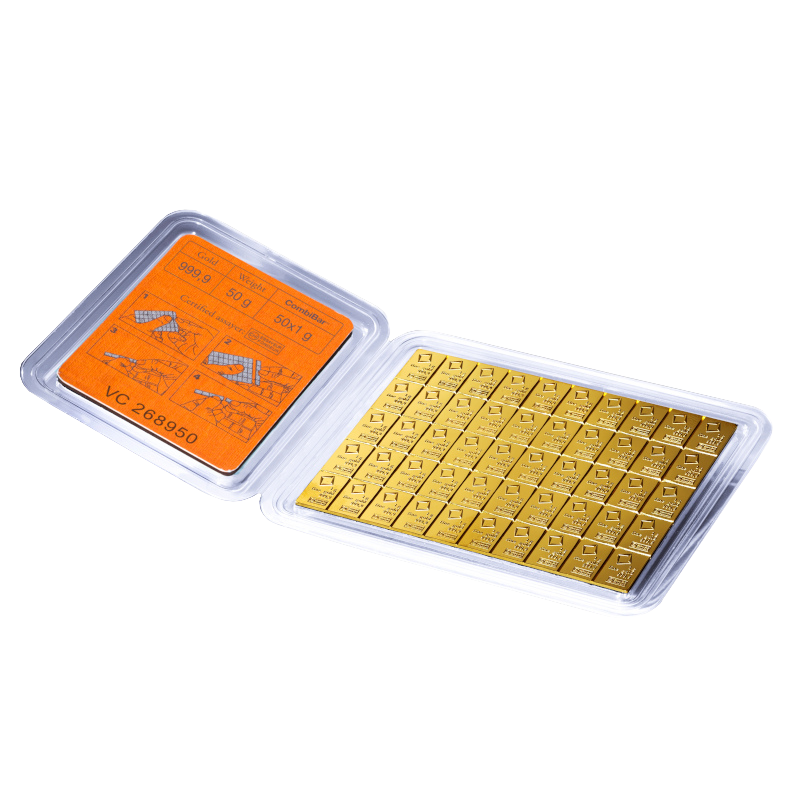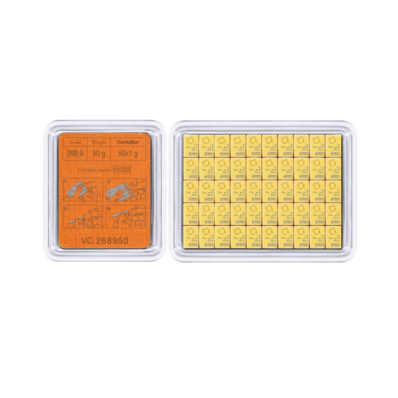 Our Swiss-made 50 gram Valcambi combi gold bars boast 24 Carats, 99.99% purity, and are LBMA approved, making them a great option for first-time investors and collectors.